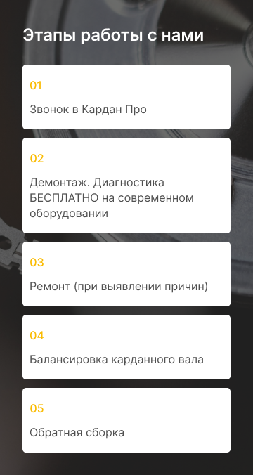 «Кардан ПРО» специализируется на производстве и ремонте карданных валов. Наши мастера имеют опыт работы с 2017 года в данной сфере, поэтому успешно решают задачи любой сложности.